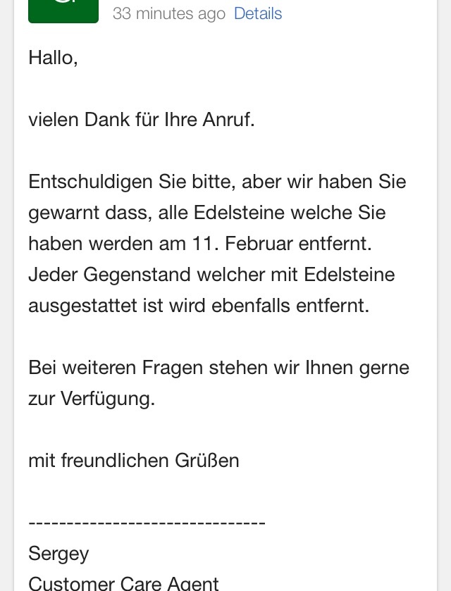 Heute wurden alle meine für Runen gekauften Gems (die ich letztes Wochenende für 21€ gekauft habe) + Ge-gemten Ausrüstungsteile entfernt!