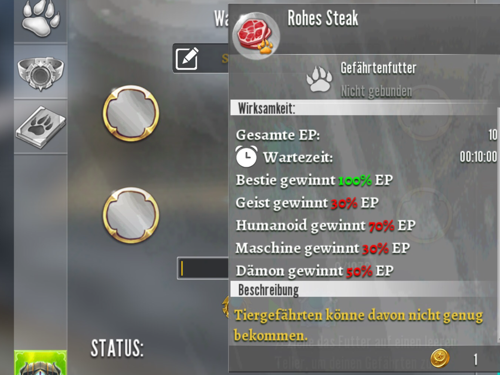 Wenn du einer Bestie rohes Steak gibst, bekommt sie 100% EP, in diesem Fall 10 EP.